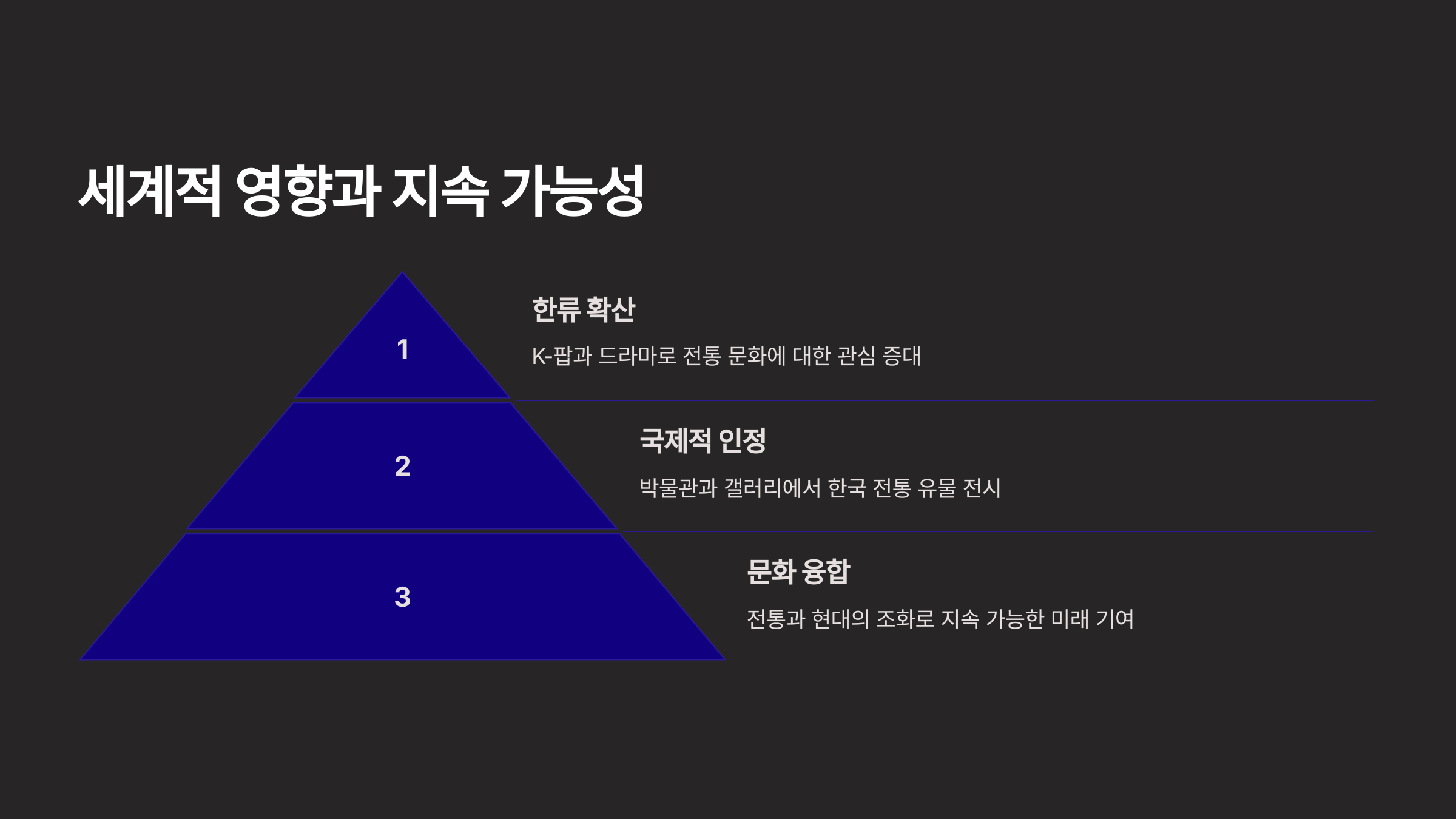 한류와 함께 한국 전통 문화는 전 세계에 소개되며, 전통과 현대를 융합한 지속 가능한 발전 모델로 자리 잡고 있습니다.