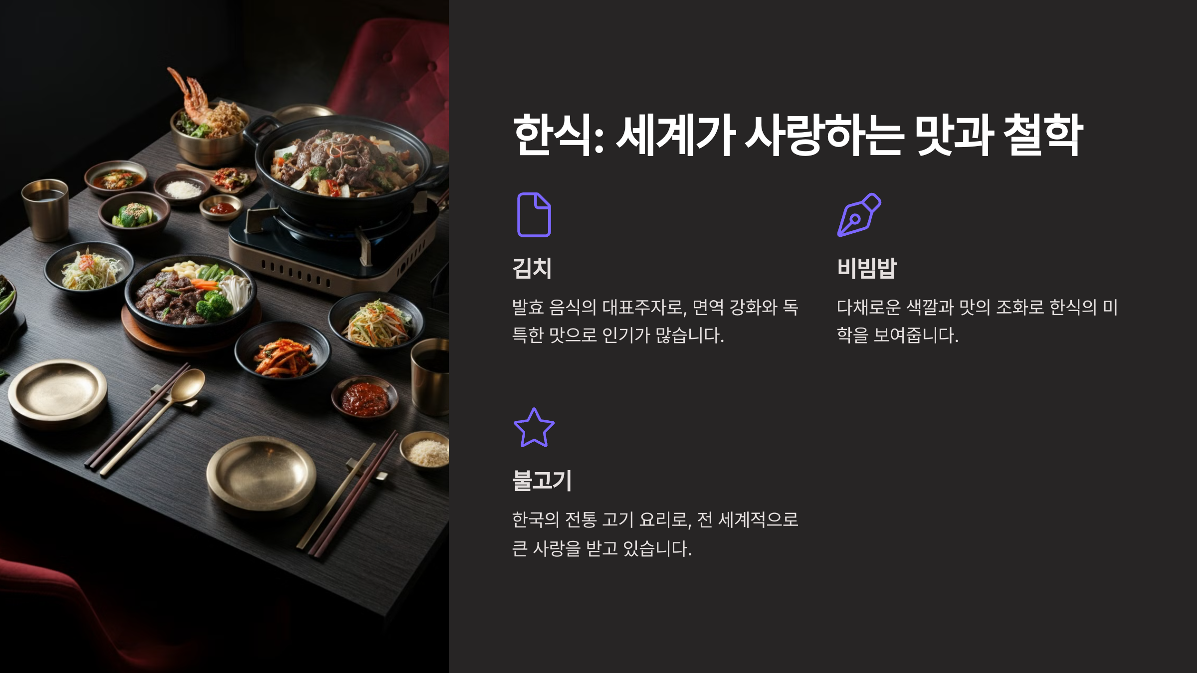 한식은 전통적으로 건강과 조화를 중시하며, 세계적으로 사랑받는 한국의 대표적인 문화입니다.