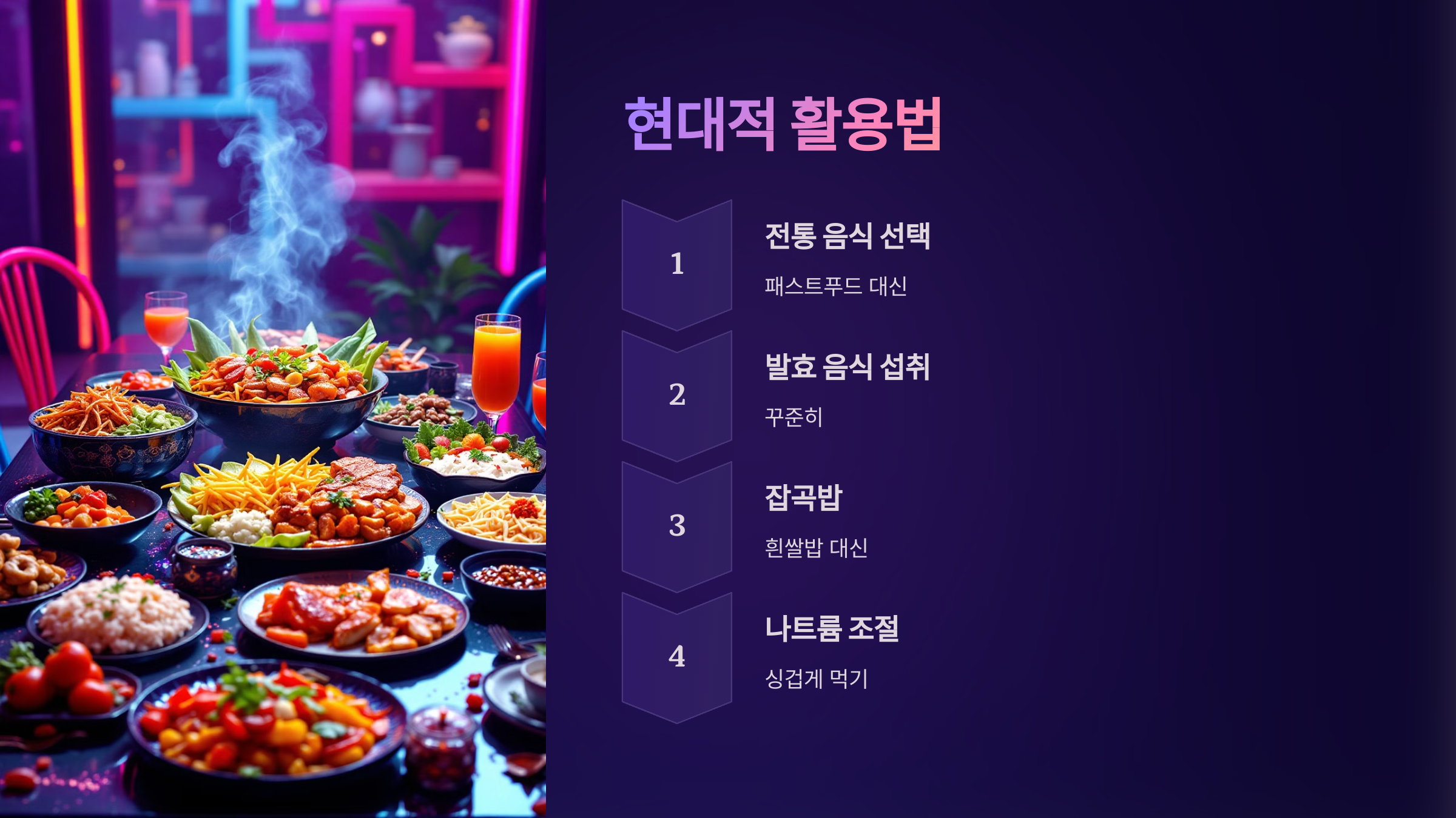 한국 전통 음식이 건강에 좋다는 것은 널리 알려져 있지만, 현대인들이 이를 실생활에서 쉽게 실천하는 방법도 중요합니다.